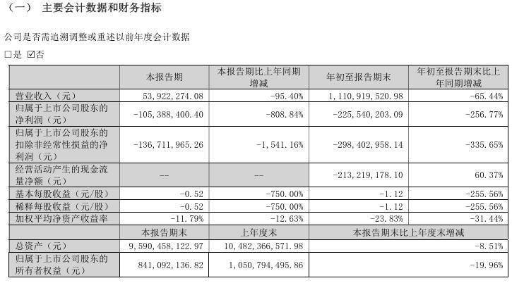 其中第三季度,公司营业收入为5392万元,同比下降95.4%;归母净利润亏损1.05亿元,同比下降808.8%;扣非归母净利润亏损1.37亿元,同比下降1541.2%;EPS为-0.5207元。